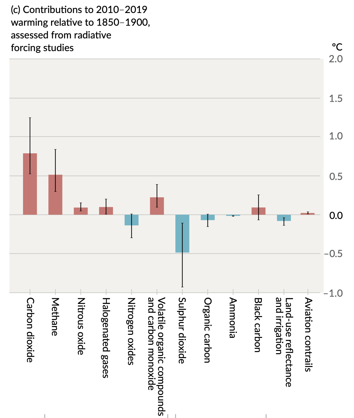Climate change and the greenhouse effect are primarily caused by CO2. But methane and other non-CO2 greenhouse gases like nitrous oxide, halocarbons, and ozone together contribute significantly also. According to the latest IPCC assessment (AR6) methane alone is responsible for about 75% of the present-day global temperature rise due to CO2. So global warming is definitely not only about CO2. The non-CO2 greenhouse gases, particularly methane, require attention also.